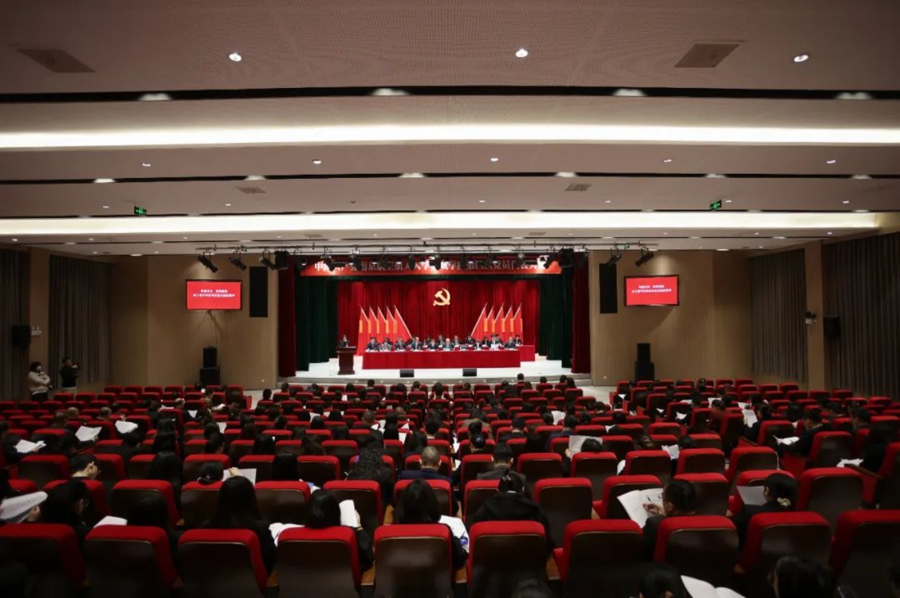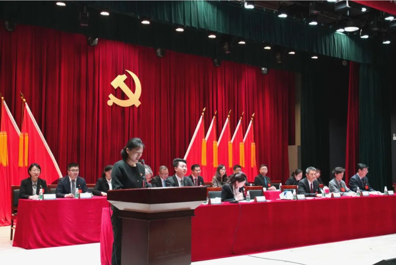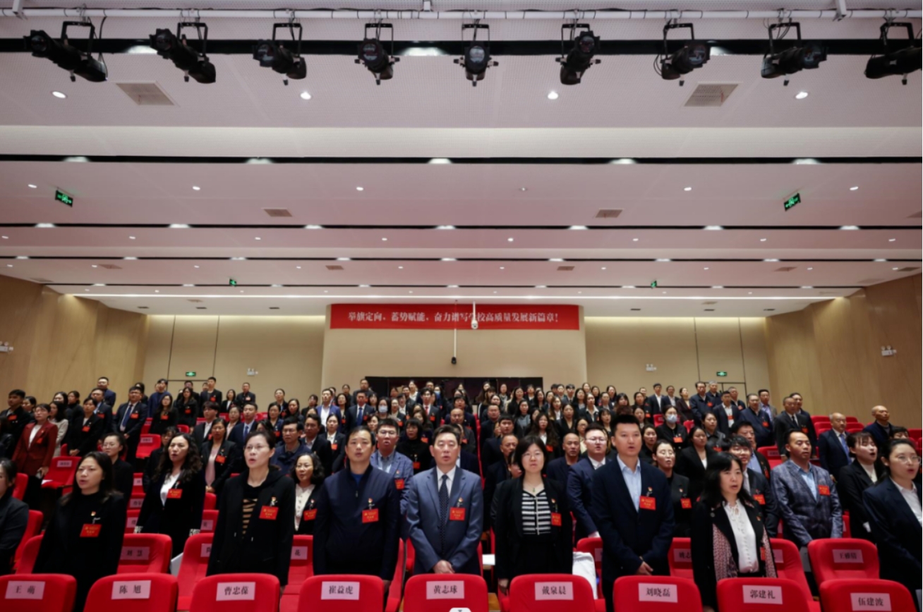 大会会场气氛庄严热烈,主席台正中悬挂的中国共产党党徽熠熠生辉,10面红旗鲜艳胜火,分列两侧。会场上,“举旗定向,蓄势赋能,奋力谱写学校高质量发展新篇章”的标语庄重醒目。