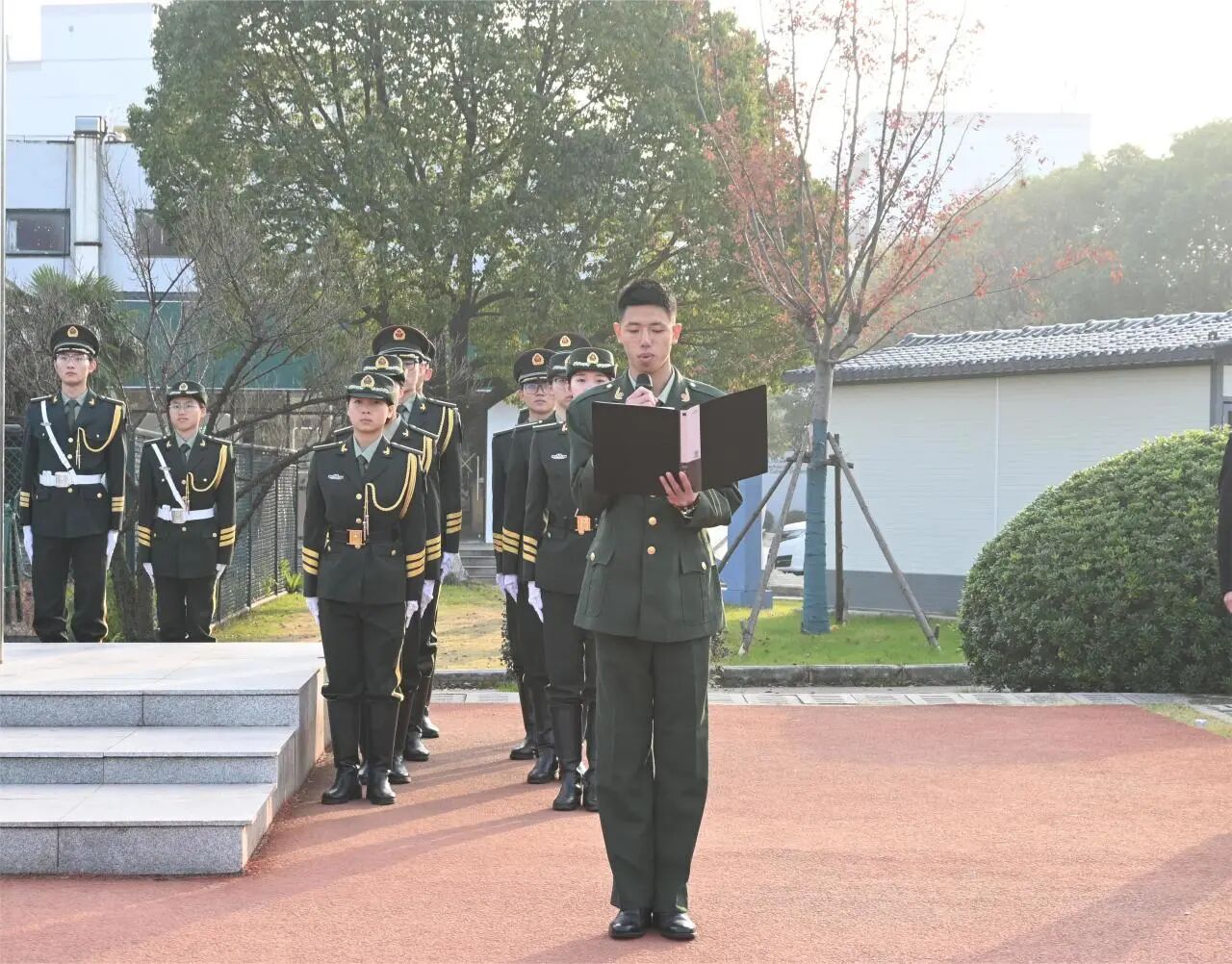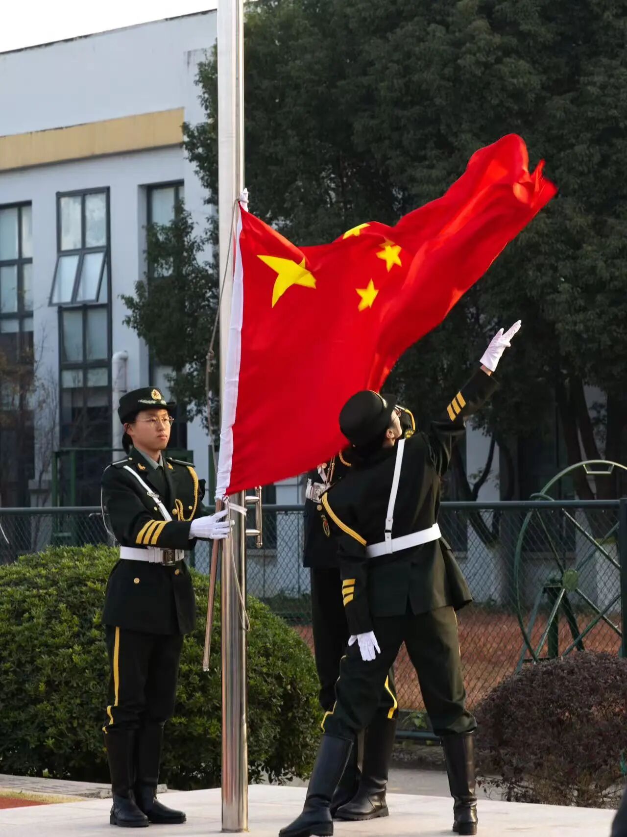 上午8时整,伴随铿锵有力的步伐,国旗护卫队队员以挺拔的姿态护送国旗入场,当雄壮的《义勇军进行曲》响起,五星红旗迎着朝阳冉冉升起,在场师生全体肃立行注目礼,国旗的鲜红与晨光交相辉映,法治的庄重与信仰的温度在这一刻深深镌刻在每个人心中。