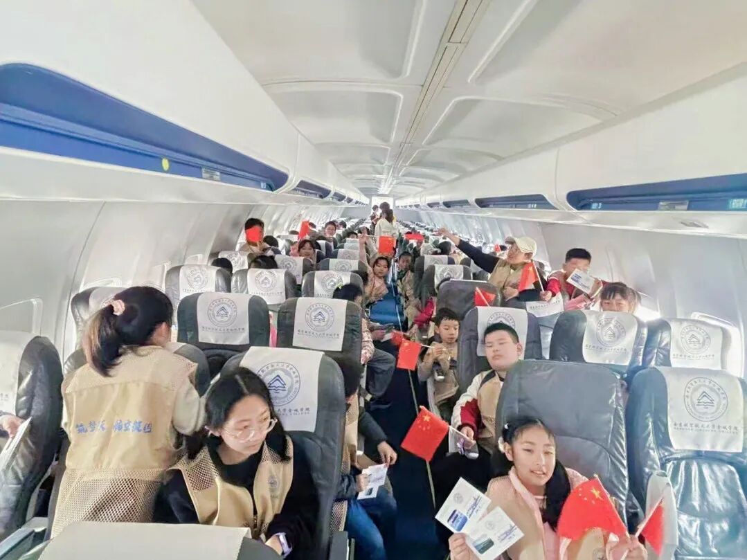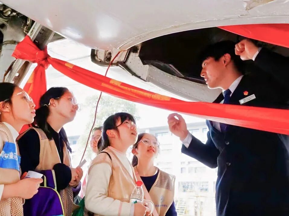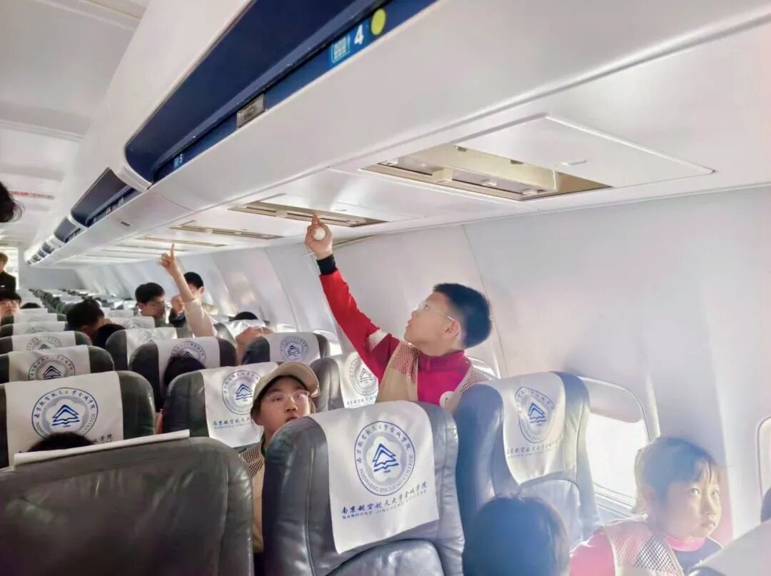 航空运输与工程学院于彪老师用生动语言揭秘飞机的机翼、发动机等构造,孩子们瞪大眼睛听得入迷。在客舱里,“两弹一星”精神志愿宣讲团的大哥哥大姐姐演示了系安全带、紧急出口位置等乘机小常识。