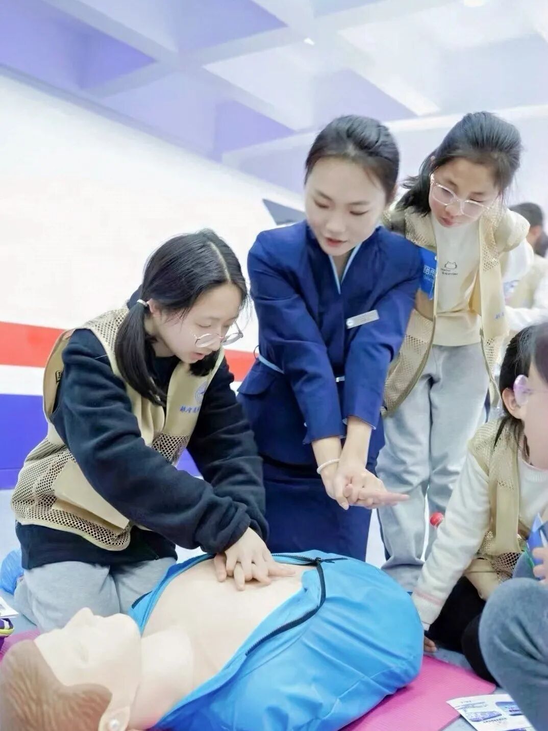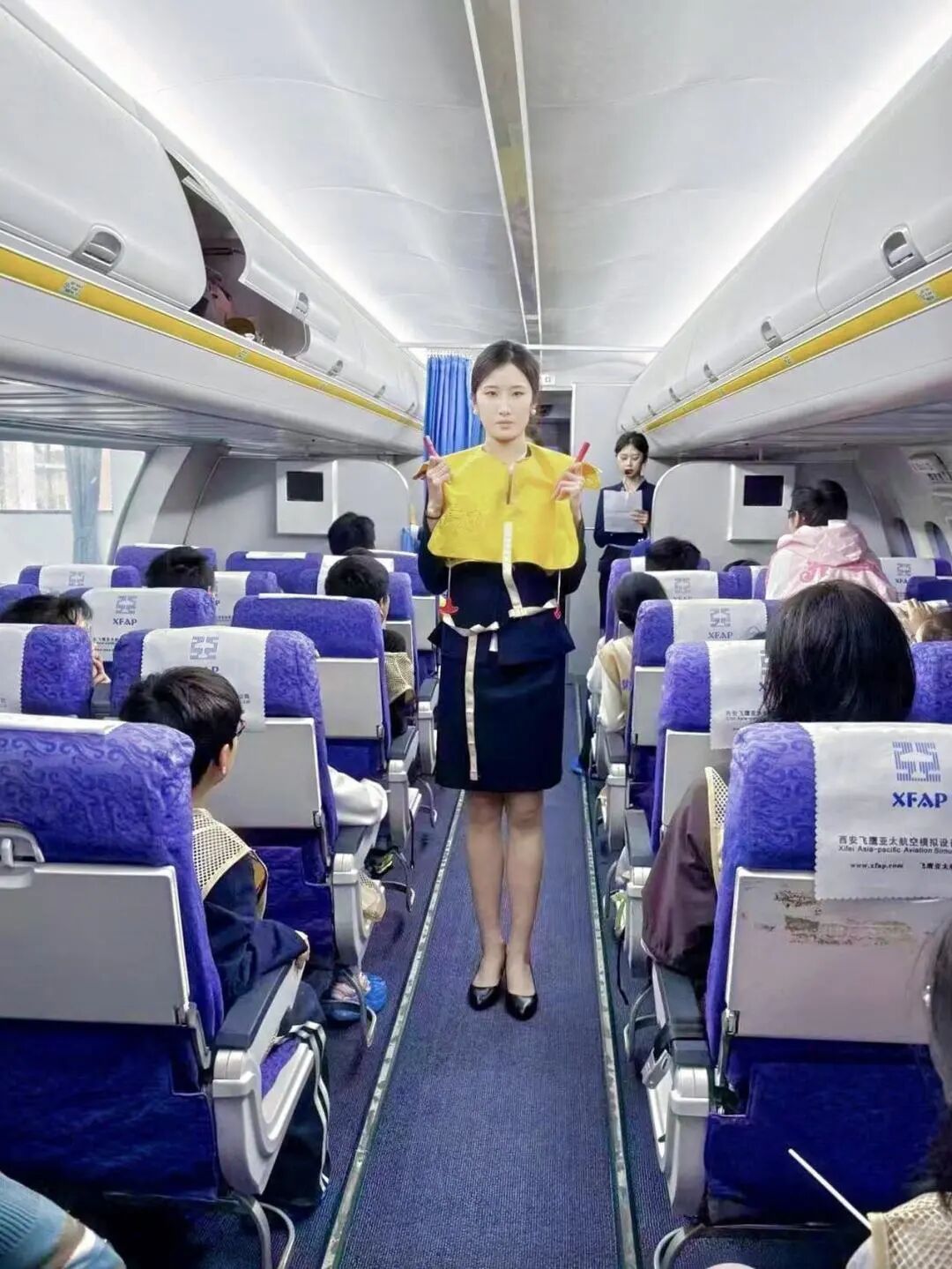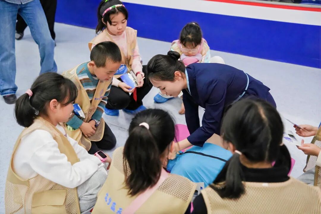 航空运输与工程学院袁沁雪和丁丁老师带来氧气面罩、救生衣等道具,手把手教同学们如何在紧急情况下保护自己。小伙伴们认真模仿,俨然一个个小小安全员。